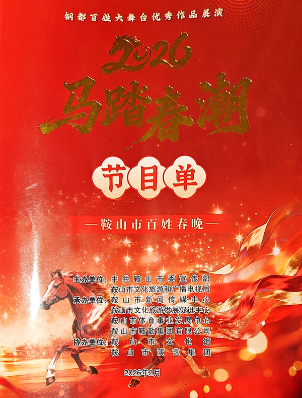 百艺联盟网讯(华龙 文/摄影)2026年2月10日19时,在辽宁省鞍山大剧院由中共鞍山市委宣传部、鞍山市文旅广电局联合主办的2026年鞍山市百姓春晚“马踏春潮”盛宴上演。