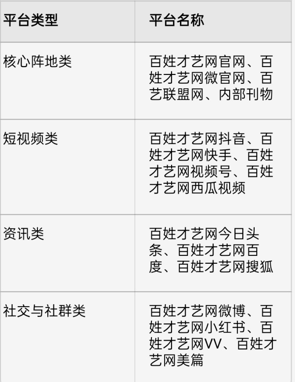 - 核心阵地类:百姓才艺网官网、微官网、百艺联盟网、内部刊物,承载全面权威内容,是才艺展示与互动的主平台。