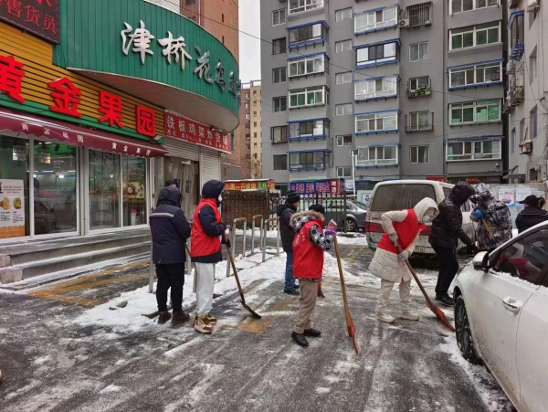 龙年第一场大雪给居民带来惊喜和兴奋的同时,也给道路交通、居民生活和出行带来了诸多不便。为了及时清除积雪,确保居民出行安全,2月19日上午,津桥街道百兴社区召集社区党员、社区志愿者、社区工作人员开展扫雪除冰志愿服务活动。天气寒冷,北风呼啸,雪层覆盖着冰层,除雪难度加大,但是都没有抵挡住大家扫雪的热情。志愿者们手持铁锹、雪铲,在辖区的主次干道清扫积雪。你一锹,我一铲,大家相互配合、齐心协力,一点点地将积雪和冰层铲起,将积雪堆积成一个个雪堆。寒风夹着雪花,面对极端天气,大家丝毫没有退缩,手中的扫雪工具不停地挥舞着,大家充满干劲,忙得浑身是汗,大家身上的“志愿红”分外耀眼,在寒冷的天气增添一抹亮现的色彩,欢声笑语中扫出了一条干净安全的道路。